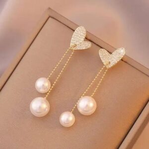 Add charm and elegance to your style with these heart-shaped Korean pearl dangle earrings. Featuring sparkling crystal-studded hearts and double pearl chains, these gold-plated earrings are perfect for parties, dates, or formal events. Lightweight and comfortable, they make a timeless addition to any jewelry collection.