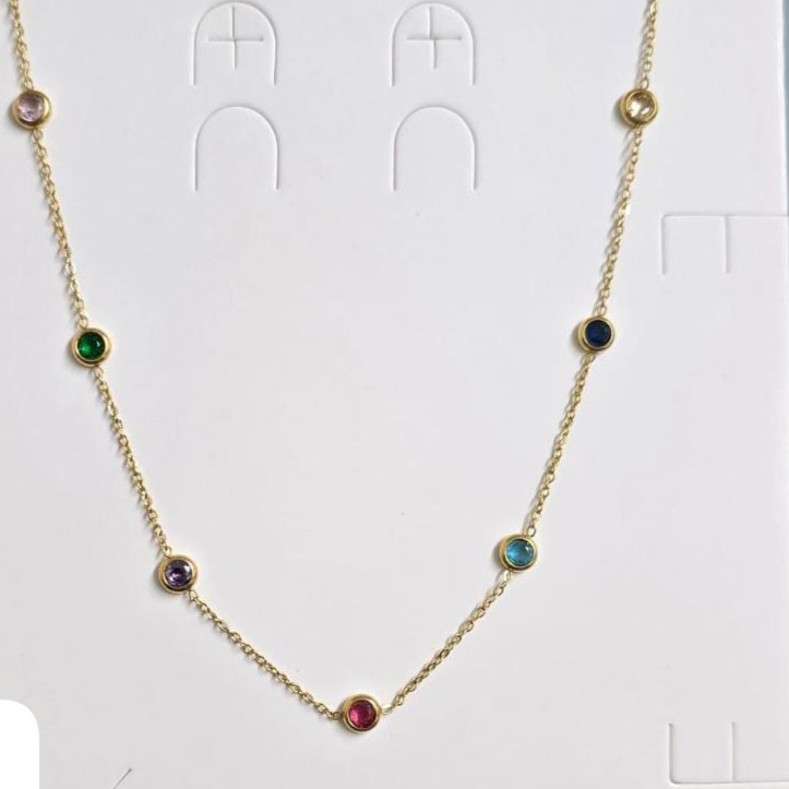 Add a pop of color with our exquisite anti-tarnish necklace, the “Sapphire Station Necklace” style with a vibrant twist. This golden multicolor station necklace features uniformly spaced, bezel-set cubic zirconia in an array of captivating hues. Perfect for adding subtle sophistication and a playful touch, this trending necklace is versatile for any occasion. Enjoy its enduring brilliance thanks to its resilient, tarnish-resistant coating.